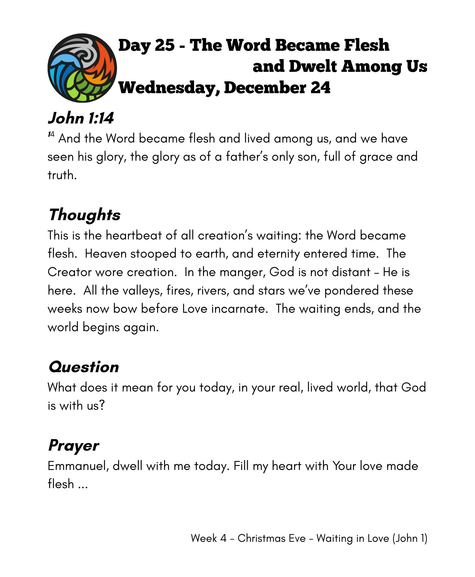All Creation Waits All Creation Waits, Day 25 – The Word Became Flesh and Dwelt Among Us by admin|Published December 24, 2025 Day 24 – The Light Shines in the Darkness Home Day 25 is the last day of All Creation Waits